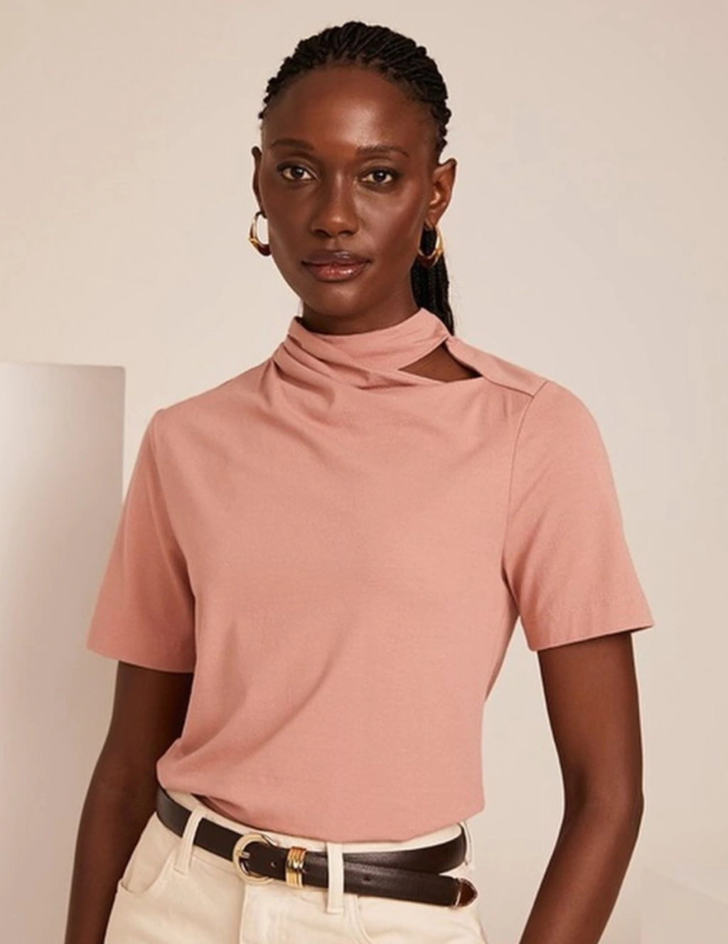 POR QUE AMAMOS: Confeccionada em malha de alta qualidade, esta blusa possui gola alta, mangas curtas e recortes vazados, garantindo um visual sofisticado e arejado. O fechamento posterior por botão e o acabamento pespontado adicionam um detalhe especial, tornando-a perfeita para diversas ocasiões.